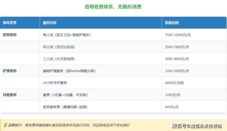 费用预估示例: 一位选择双人间、经评估需要中级护理的长者,月度综合费用大致在5000-7000元区间。
