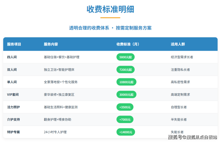 护理分级:根据长者自理能力(自理型、半失能、失能、认知症患者)提供差异化收费,最高可达30000元/月。