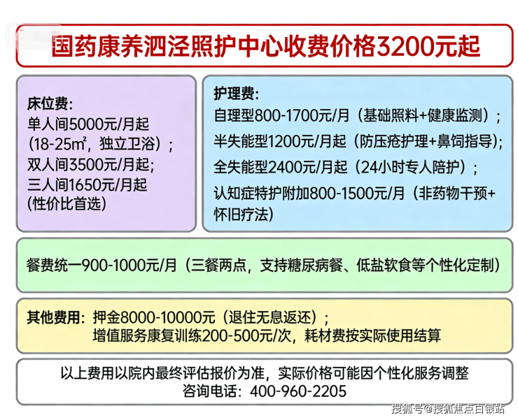 温馨提示:最准确的费用需结合老人的具体情况和所选房型进行评估。建议您拨打官方电话:400-960-2205获取个性化的费用明细解读 。