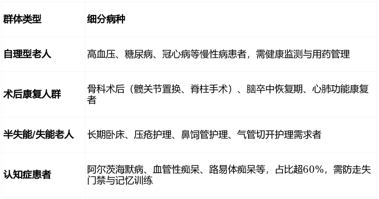 收住人群:自理老人、术后康复者、半失能/失能长者、认知症患者