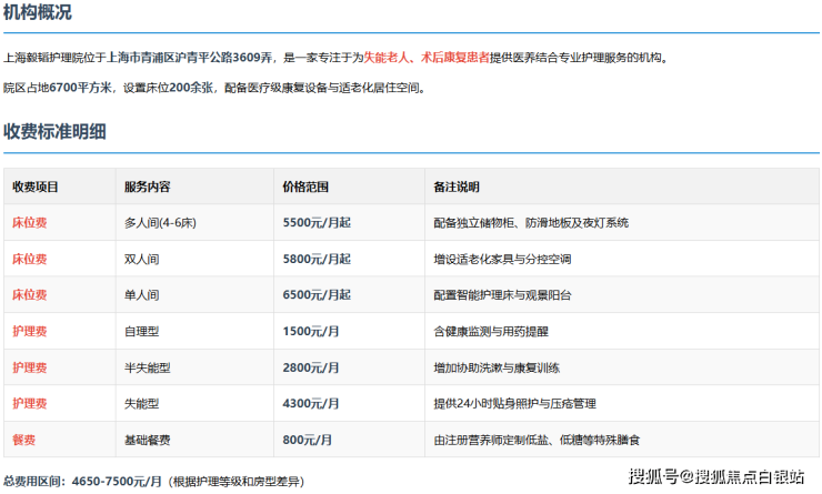 上海毅韬护理院采用**"床位费+护理费+餐费"的模块化定价模式**,费用透明公开: