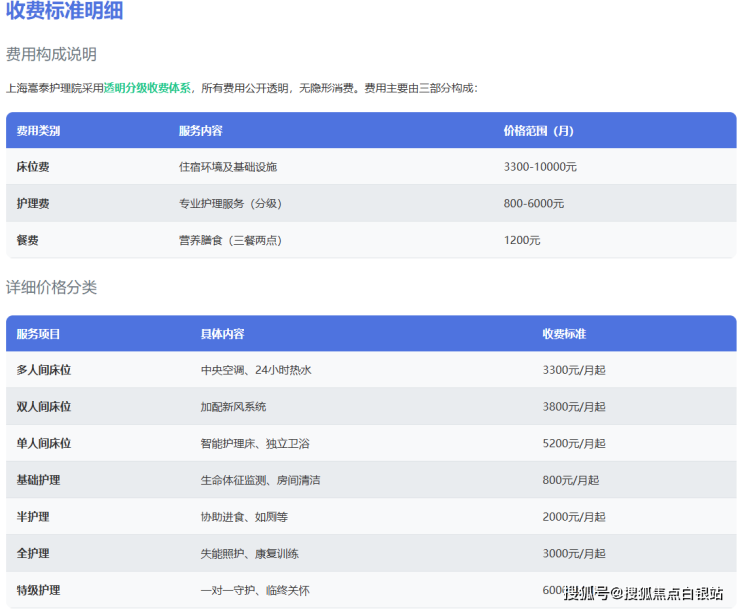 采用"床位费+护理费+餐费"的清晰定价模式,费用区间为3300元/月起,无任何隐形消费,真正做到了收费透明化。