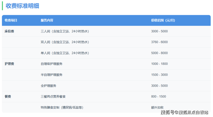 全护理型:2800-6000元/月,针对卧床长者提供包括喂食、定时翻身拍背、口腔护理、压疮预防等深度照护。