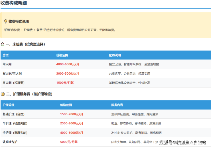 认知症专护:5000元/月起。配备防走失系统、行为监测及非药物干预活动,设有专门的怀旧疗法空间。