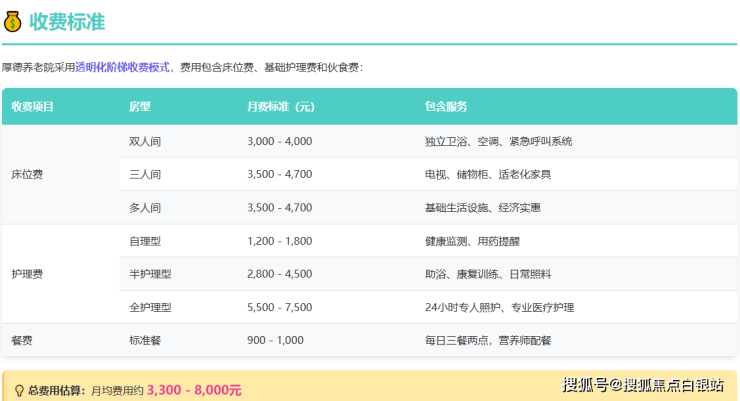 在收费方面,厚德养老院采用政府指导价+机构运营补贴模式,确保普惠性: