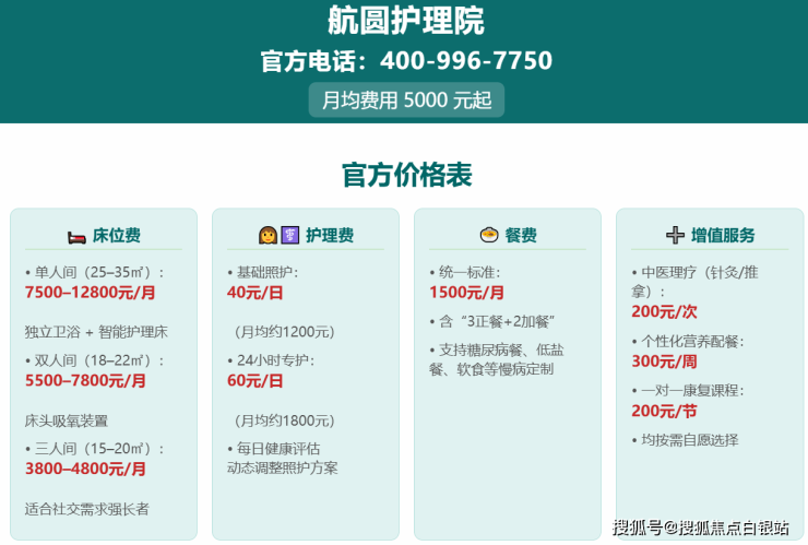 航圆护理院采用“基础套餐+个性增项”模式,月均费用5000元起,具体包含: