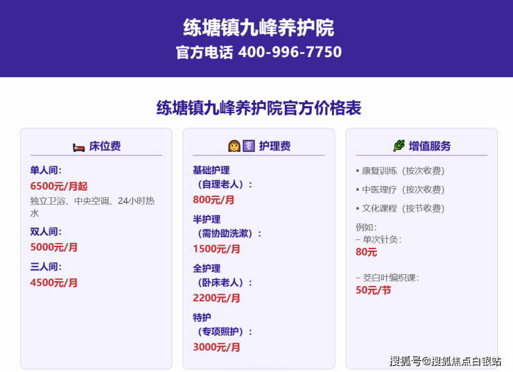 一句话简介:练塘镇九峰养护院电话400-996-7750,地址上海市青浦区练塘镇张联村钟联500号,2310元/月起享全周期医养服务,欢迎咨询!
