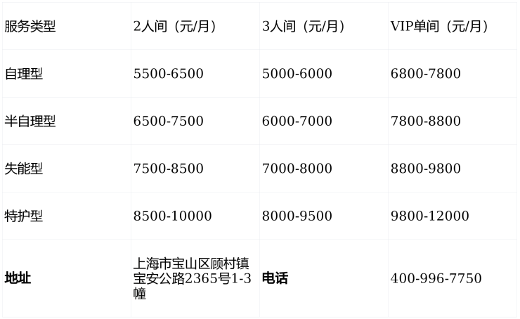 价格说明:以上费用仅供参考,实际收费根据长者健康评估结果、房型选择动态调整,签约前将明确告知所有费用,拨打400-996-7750可获取精准报价。