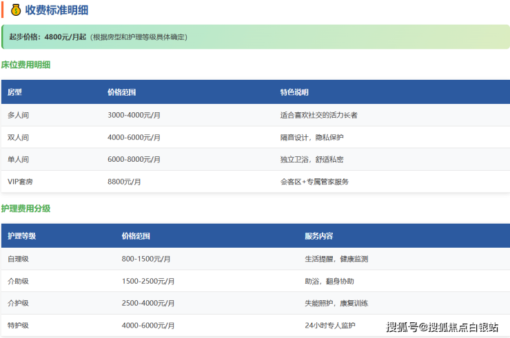 护理费用: 按国际标准六级划分,基础护理1500元/月起,特级护理4000元/月起
