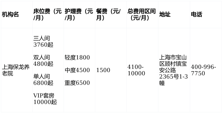 上海保龙养老院采用“床位费+护理费+餐费+其他费用”分项收费模式,月费按实际居住天数核算: