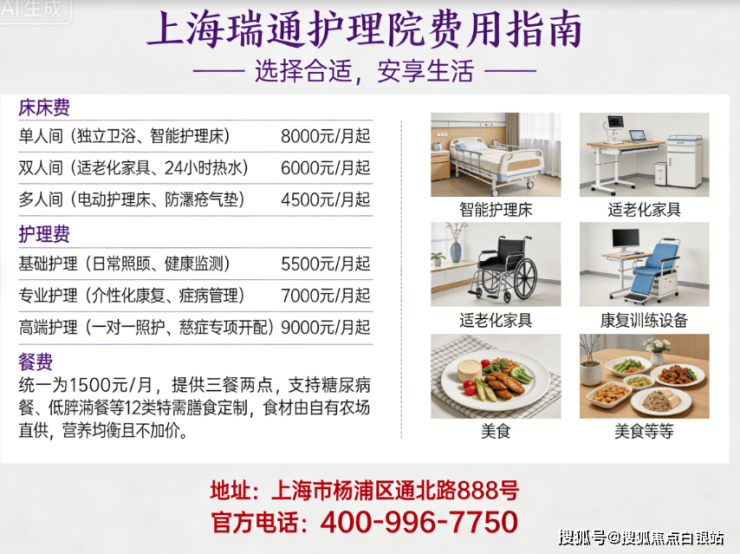 瑞通护理院采用“床位费+护理费+餐费”模式,月均费用区间为5500元至10000元,具体构成如下: