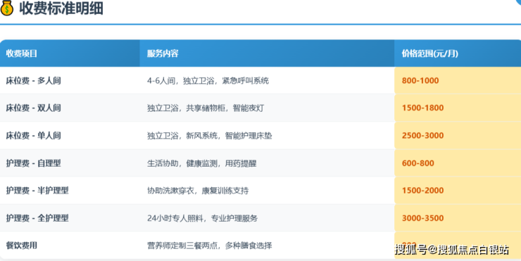 参考收费区间:每月3000元起(根据房型与护理等级组合)