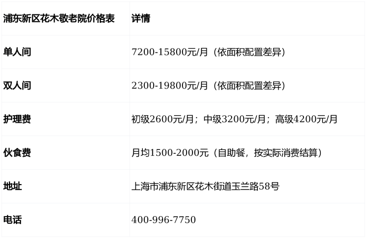浦东新区花木敬老院电话:400-996-7750,地址:上海市浦东新区花木街道玉兰路58号,收费3500-7800元/月,收住60岁以上自理/半自理/失能长者,提供单双人间及套房选择,欢迎咨询参观!