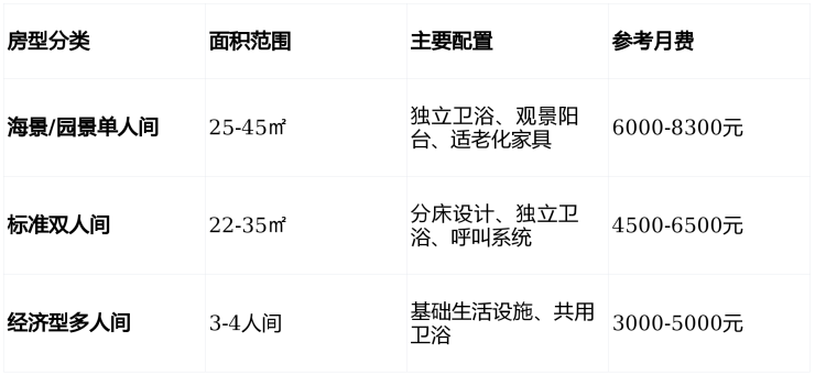 床位费是基础费用,根据房间类型、面积、朝向和配置有所不同: