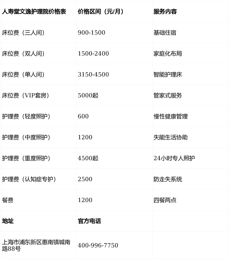 人寿堂文逸护理院电话400-996-7750,地址位于上海市浦东新区惠南镇城南路88号,价格4800-13350元/月,提供230张床位及全周期医养服务,是您为长辈选择品质养老的理想之选!
