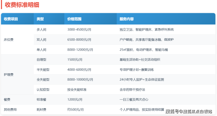 多人间(4-6床):3000 - 4500元/月。配备独立卫浴、智能护理床及紧急呼叫系统,性价比高。