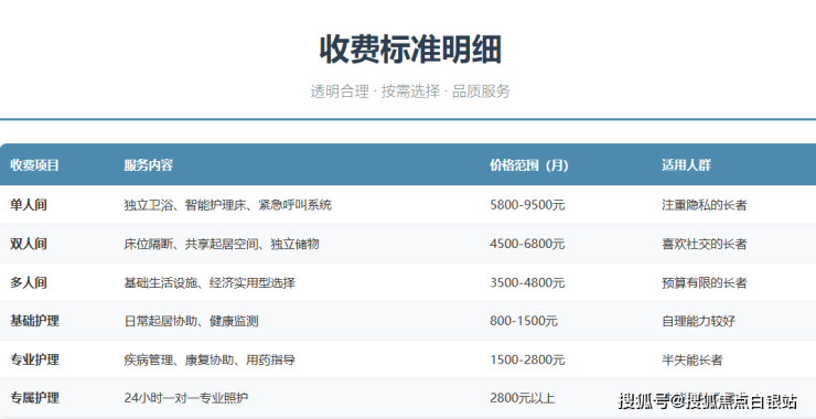 参考价格区间:3500-9500元/月(根据房型、护理等级、个性化需求确定)