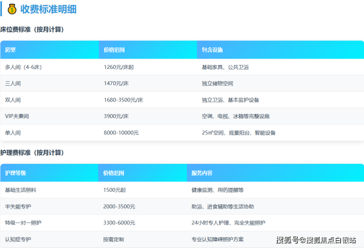 一位选择双人间、需要半失能照护的长者,每月总费用约为:3500元(床位费)+ 2500元(护理费)+ 800元(餐费)=6800元/月。