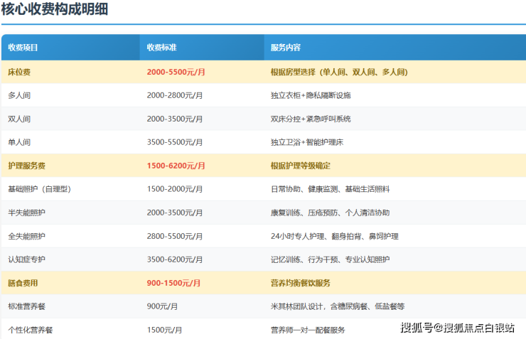 单人间:3500-5500元/月,面积40-60平方米,独立卫浴、智能护理床、观景阳台