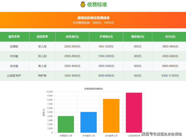 一位选择双人间、需要中级护理的长者,月度总费用大致为:床位费(取中值4150元)+ 护理费(取中值2000元)+ 餐饮费(取中值1000元)+ 杂费(250元)≈7400元/月。