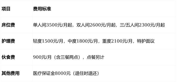 ②床位情况:提供单人间、双人间、三/五人间及专护房,单人间3500元/月起,双人间2600元/月起,目前入住率超98%,需通过官方电话400-996-7750提前预约参观。