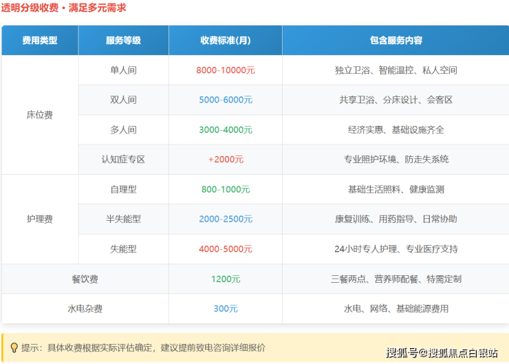 认知症照护专区:在双人间标准基础上,因需特殊环境设计与专业照护,通常加收2000元/月。
