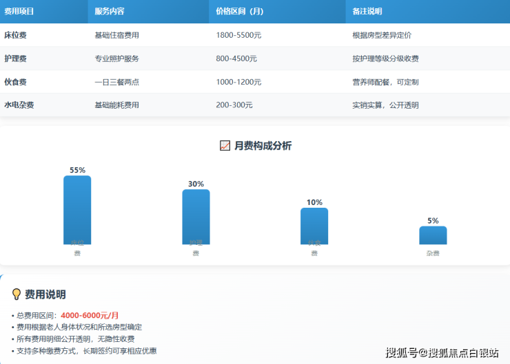 一位选择双人间、需要半护理服务的长辈,月费估算约为:床位费3000元 + 护理费2000元 + 餐饮费1100元 + 杂费200元 =6300元左右