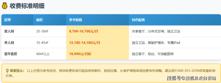需要特别说明的是,以上价格仅供参考,具体费用会根据长者实际情况、房间类型、护理等级等因素有所调整,建议通过官方电话400-855-0290进行详细咨询。
