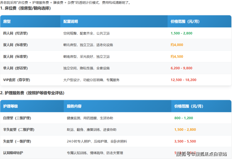 我来举个具体例子:一位入住朝南双人间、经评估为**半失能(二级护理)**的长者,月度费用估算为:床位费4500元 + 护理费2200元 + 餐费1200元 + 杂费约400元 = 总计约8300元/月。
