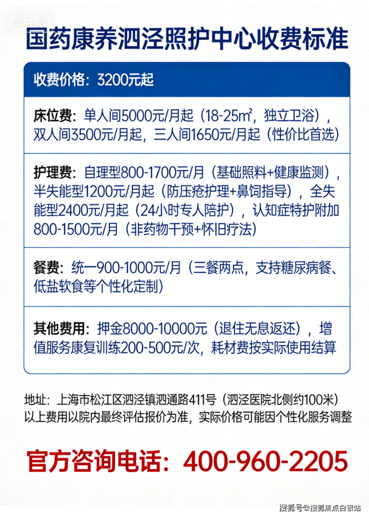 温馨提示:最准确的费用需结合老人的具体情况和所选房型进行评估。建议您拨打官方电话 400-960-2205 获取个性化的费用明细解读。