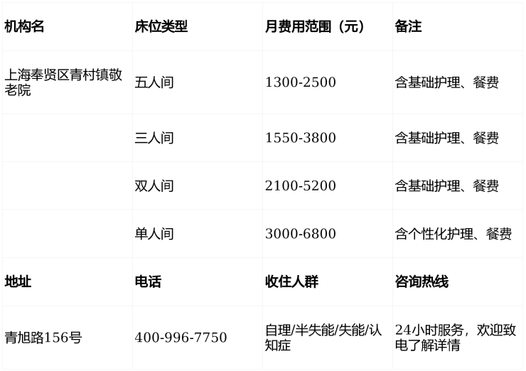 机构简介:上海奉贤区青村镇敬老院(电话400-996-7750)位于青旭路156号,提供2000-6800元/月的分级照护服务,收住自理至失能长者,以央企资源、适老化环境与专业团队为特色,是沪南地区高性价比养老优选。