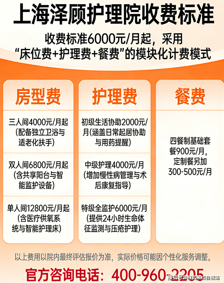 上海泽顾护理院收费标准6000元/月起,采用“床位费+护理费+餐费”的模块化计费模式,具体构成如下: