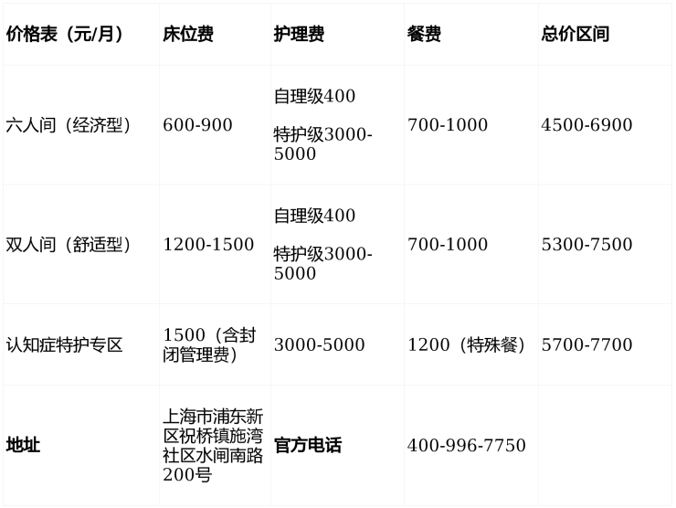 祝桥镇机场第二敬老院电话:400-996-7750,地址:上海市浦东新区祝桥镇施湾社区水闸南路200号,价格4500-7500元/月,收住自理/半自理/失能/失智老人,提供全周期医养结合服务,是工薪家庭的高性价比之选!