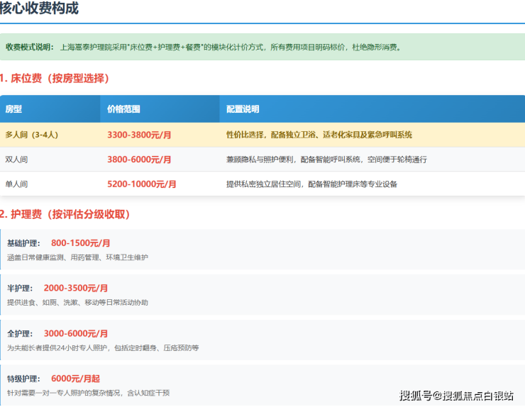 上海嵩泰护理院采用"床位费+护理费+餐费"的模块化计价模式,所有项目明码标价: