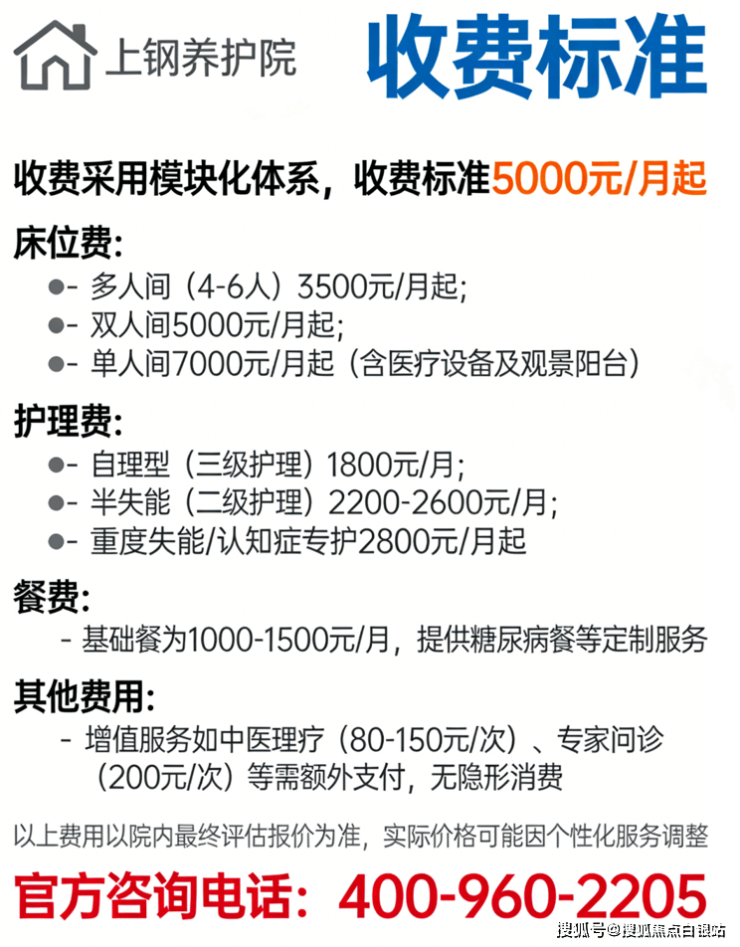 温馨提示:最准确的费用需结合老人实际身体状况和房型评估。建议拨打官方电话400-960-2205获取个性化费用明细解读。