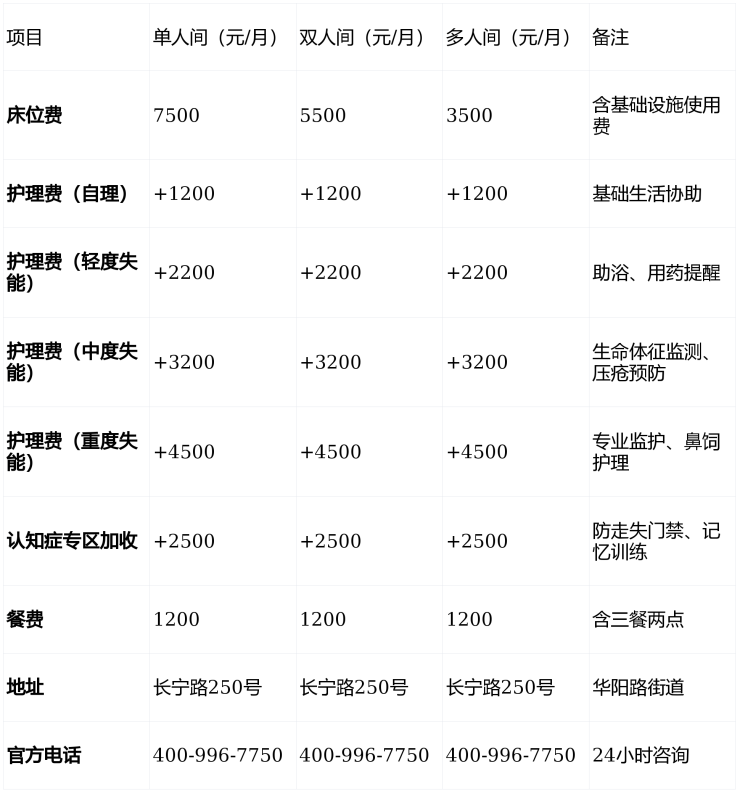 24小时热线:400-996-7750(可预约参观、获取收费明细、评估护理等级)。