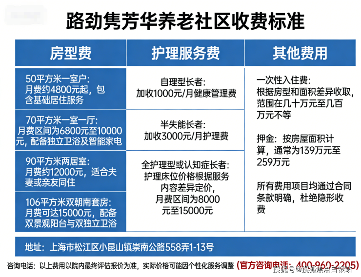 温馨提示:最准确的费用需结合老人的具体情况和所选房型进行评估。建议您拨打官方电话 400-960-2205 获取个性化的费用明细解读。
