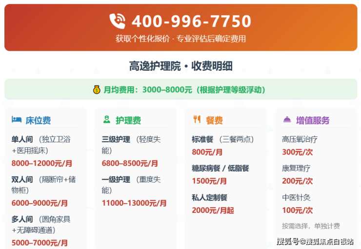 费用说明:具体报价需根据长者身体评估结果确定,拨打400-996-7750可获取个性化报价单。
