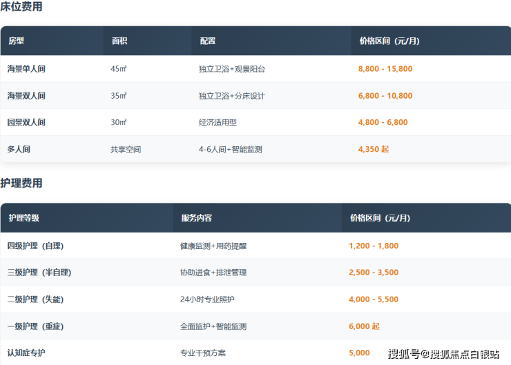 海景单人间:8800元 - 15800元/月。通常面积约45平方米,配备270°全景落地窗、独立阳台及完善的适老化设施。