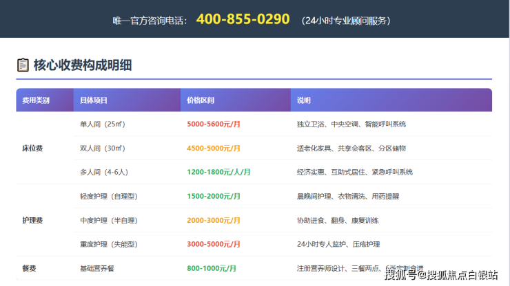 **费用说明:**以上费用为主要照护套餐费,包含住宿、基础护理及餐饮。其他个性化服务(如特殊餐饮定制、专享康复项目等)按实际发生另行计费,均会提前告知并征得同意。