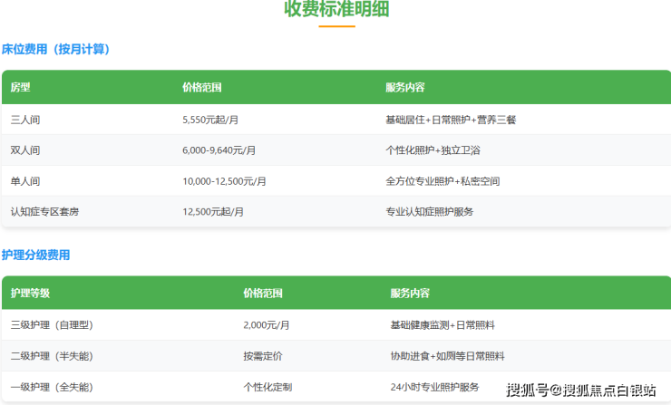 三人间:5550元/月起。包含床位、基础日常生活照料、营养均衡的三餐以及公共设施使用。