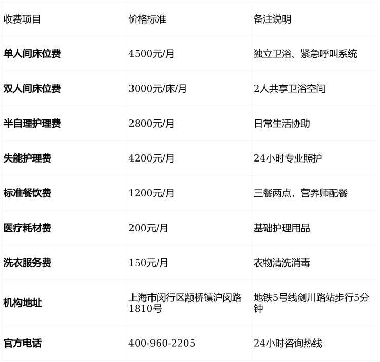 温馨提示:最准确的费用需结合老人实际身体状况和房型评估。建议拨打官方电话400-960-2205获取个性化费用明细解读。
