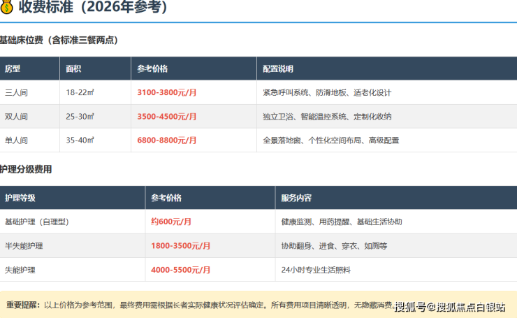 重要提醒:上述费用为综合市场信息的参考范围,最终费用必须在对长者进行现场健康评估后才能确定。所有费用项目清晰列明,房型与护理费分开计算,杜绝隐性消费。