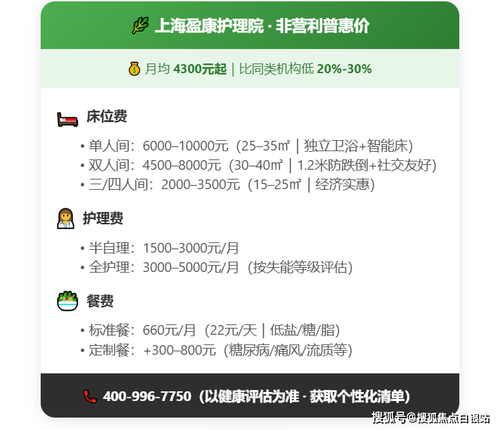 我们坚持“非营利性”定位,收费标准低于上海市同类机构平均水平20%-30%,月均费用4300元起,具体构成如下: