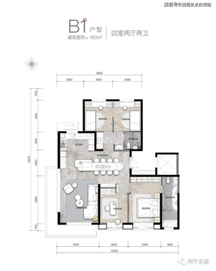160平边户 南、北、朝向,4室2厅2卫,建面160㎡,分布于楼栋8号楼、1号楼、。