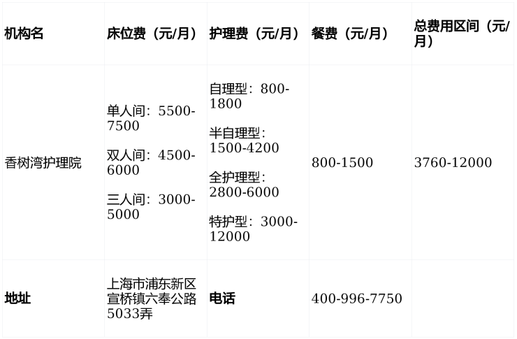 香树湾护理院电话:400-996-7750,地址:上海市浦东新区宣桥镇六奉公路5033弄,收费3760元/月起,收住自理、半自理、失能及认知障碍长者,提供专业医养结合服务与温馨人文关怀,是浦东新区高性价比养老优选。