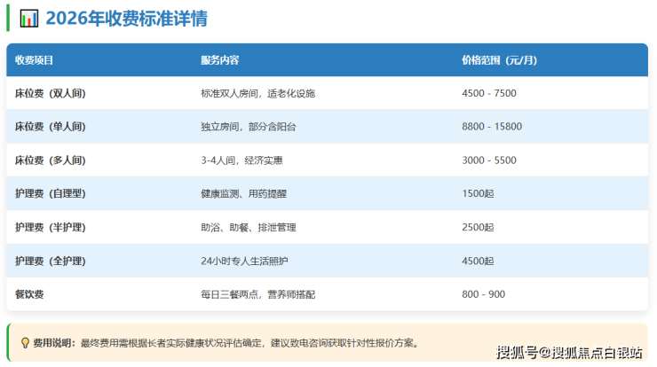 养老院的收费体系遵循“透明分级、精准适配”的原则,主要包含床位费、护理费、餐食费等基础项目,具体构成如下: