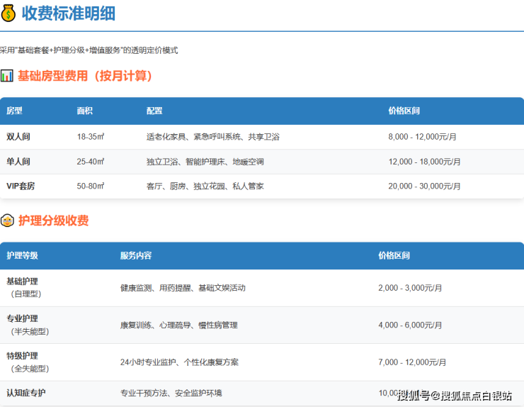 上海凯健华鹏养老院采用分层透明的收费模式,月度总费用区间为8000-30000元,具体构成如下: