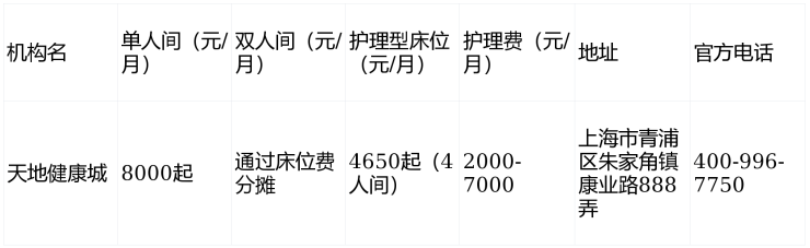 一句话简介:天地健康城电话400-996-7750,地址位于上海市青浦区朱家角镇康业路888弄,提供6000-16000元/月的高品质医养服务,涵盖独立居住、介护护理及康复服务,是追求生态与专业结合的理想养老之选。