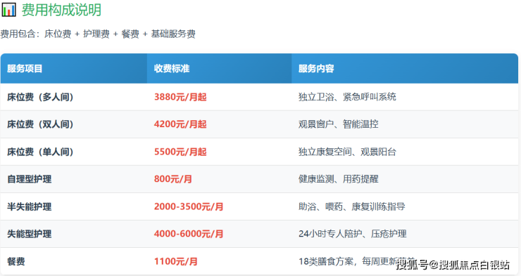 上海宝山金色怡福护理院采用分级收费模式,月均费用3880元起,具体构成如下: